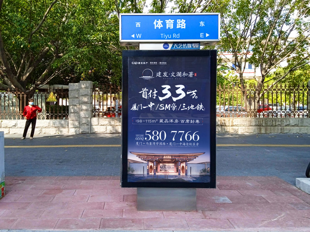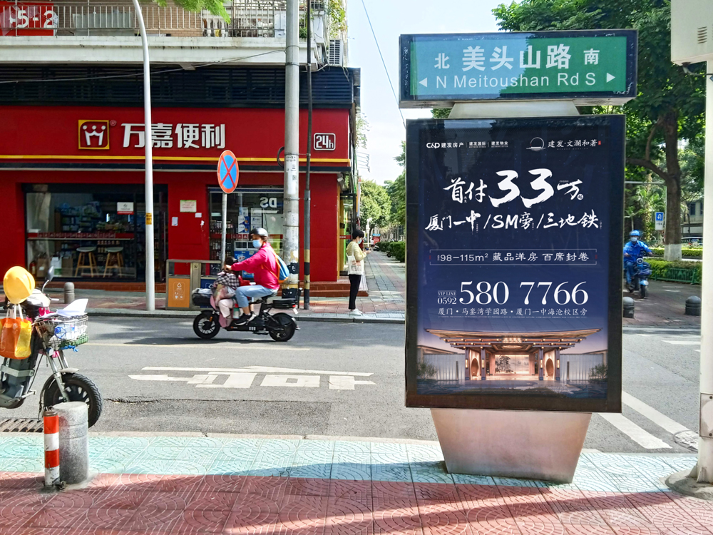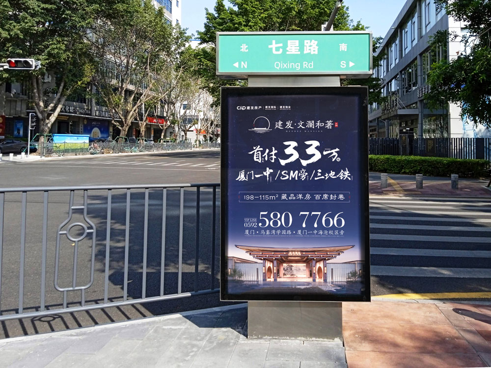 本次建發(fā)文瀾和著二期樓盤再次與天藝傳媒攜手,共同續(xù)寫輝煌。建發(fā)文瀾和著二期開盤,再次選擇投放戶外城市路名牌超過100座,且均在島內(nèi)黃金點(diǎn)位覆蓋,包括主干道,如:廈禾路、體育路、金尚路、湖濱中路、禾祥西路、禾祥東路等車流人流密集路段,以及商超圈周邊路段,如:火車站羅賓森、思北路口、輪渡周邊。