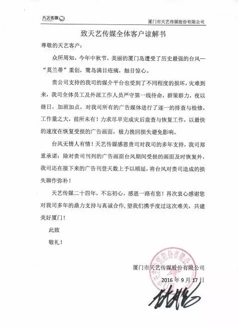 臺(tái)風(fēng)無情人有情!天藝傳媒感恩貴司對(duì)我司的多年支持,我司鄭重承諾:除對(duì)貴司刊列的廣告畫面臺(tái)風(fēng)期間受損的畫面及時(shí)恢復(fù)外,我司還在接下來的廣告刊登天數(shù)上予以順延,將臺(tái)風(fēng)對(duì)貴司造成的損失聊作彌補(bǔ)!